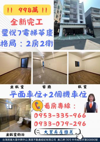 大里房屋推薦 免千萬 全新兩房兩衛+雙機車位+平面車位