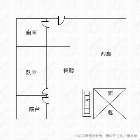 - 格局: 1房(室) 2廳 1衛 1陽台 1廚房