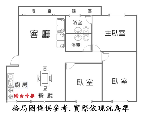 - 格局: 3房(室) 2廳 2衛 1陽台 1廚房